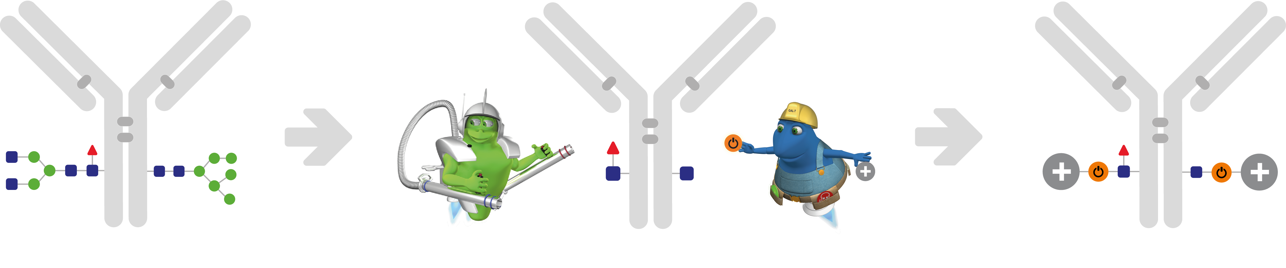 Conjugation is conventionally performed using random strategies by labeling at the ~20 readily available amines on lysine residues or at the 4-8 solvent accessible inter-chain cysteines. Although versatile, such methods often require suboptimal pH conditions and offer limited control of the labeling excess and site-occupancy, thus they are prone to influence stability, immunoreactivity and reproducibility of the final product. Site-specific strategies have become an attractive option to overcome these limitations, but often require engineering to control and stabilize the process. Conjugation at the Fc glycan sites using GlyCLICK is not only site-specific (Fig. 1) but also decreases off-target effects by disrupting the binding to Fc receptors (FcYRs) on immune cells due to the Fc glycan modification.